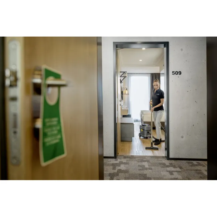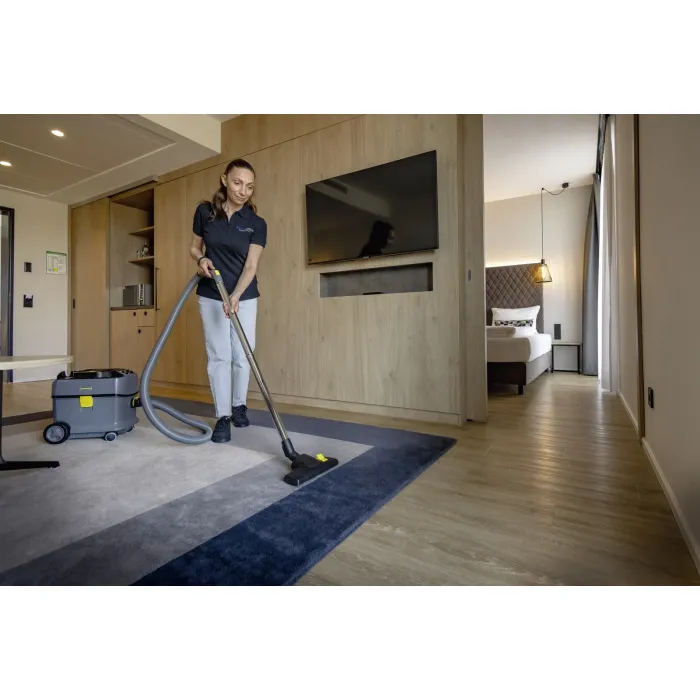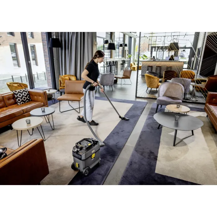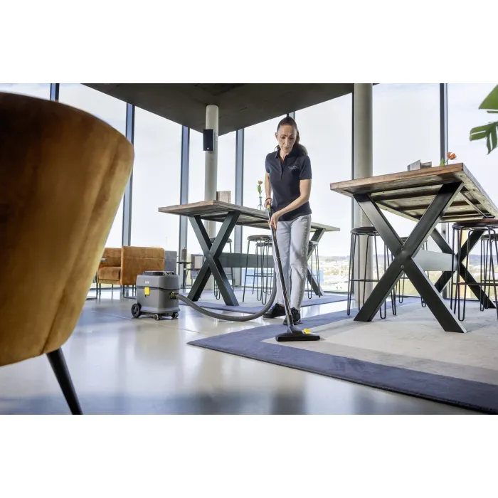 Мощната T 15/1 Bp се характеризира с тиха работа (57 dB[A]) и следователно може да се използва по всяко време и в места, чувствителни към шум. Компактната прахосмукачка е маневрена и устойчива на накланяне, а бункерът е с обем 15 литра. Разполага с дръжка за носене със сгъваема функция и може да се транспортира ергономично и близо до тялото. Освен това е изключително здрава, както шасито, корпусът, бронята и големите колела. Прахосмукачката за сухо почистване T 15/1 Bp с батерии на Kärcher впечатлява със своята устойчивост, издръжливост и атрактивно съотношение цена-качество. Тя се отличава и със своята здравина, богат набор от аксесоари и отлична всмукателна мощност благодарение на мощните батерии Kärcher Battery Power+ (36 V). 45% рециклиран материал*, използван в производството, пести ресурси и намалява енергийните нужди. Включената в доставката дюза за фуги може винаги да се съхранява на удобно място на прахосмукачката. При поискване се предлага и ултра-ефективен HEPA 14 филтър. Моля, имайте предвид, когато поръчвате, че за тази версия на машината батерията и съвместимото бързо зарядно устройство трябва да се поръчат отделно.
