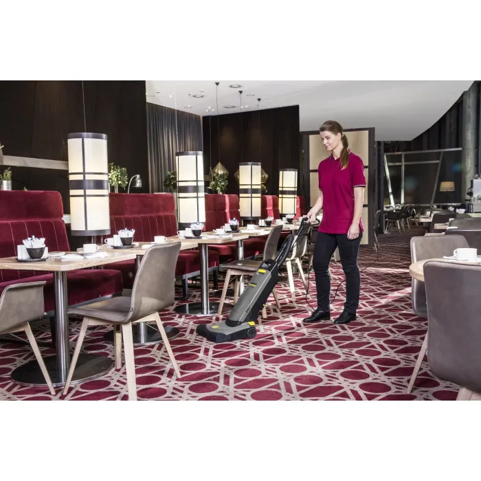 Ергономичната дръжка с вграден превключвател за включване/изключване приляга идеално в ръката, ниското тегло на машината позволява работа без умора, а аксесоарите, които са винаги под ръка, осигуряват перфектни резултати от почистването дори по ръбове и в ниши. Освен това, оптичното регулиране на четката подпомага точното ѝ регулиране спрямо височината на килима. Когато е необходимо обслужване, иновативната система за бърза смяна на захранващия кабел и възможността за смяна на четката без инструменти значително намаляват времето и разходите, които обикновено са необходими. И не на последно място, специално разработената и патентована система за сваляне позволява изключително устойчивите на разкъсване филтърни торбички от флис да се сменят почти напълно без прах. Проектирана за особено високи изисквания за почистване и площна производителност, нашата вертикална прахосмукачка с четка CV 38/2 е предопределена за ефикасно почистване на големи площи. Независимо дали в офиси или шоуруми, в хотели и ресторанти, в търговски обекти или в обществени сгради: благодарение на изключително голямата работна ширина и многото полезни детайли, почистването на килими е бързо и удобно.