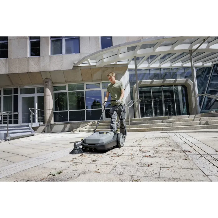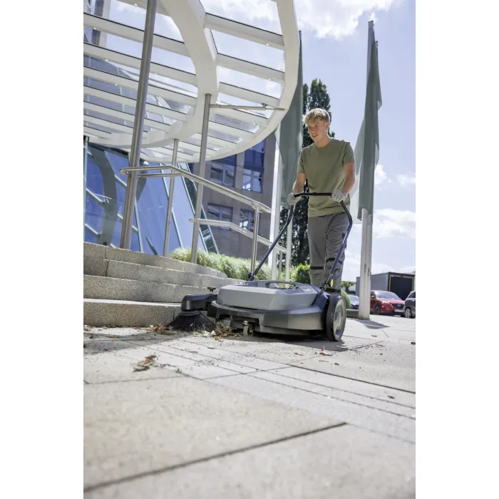 Производителността на площта е 7 пъти по-висока, отколкото с метла. Валякът за метене може да се регулира в 6 степени и в комбинация с безстепенно регулируемите странични четки постига оптимален резултат от почистването на различни подови настилки. Регулируема по височина дръжка за бутане и системата Home Base за носене на допълнително оборудване, като кофи и кошчета за боклук, осигуряват ергономична работа. Ръчната метачна машина KM 70/20 C прави почистването на повърхности без усилие и практически без прах благодарение на филтъра, валяк за метене и странична четка - независимо дали е на закрито или на открито. Това означава, че отпадъците могат да се изхвърлят заедно с праха и мръсотията с една стъпка. След приключване на работата, KM 70/20 C 2SB може да се съхранява в икономично на място положение за паркиране.