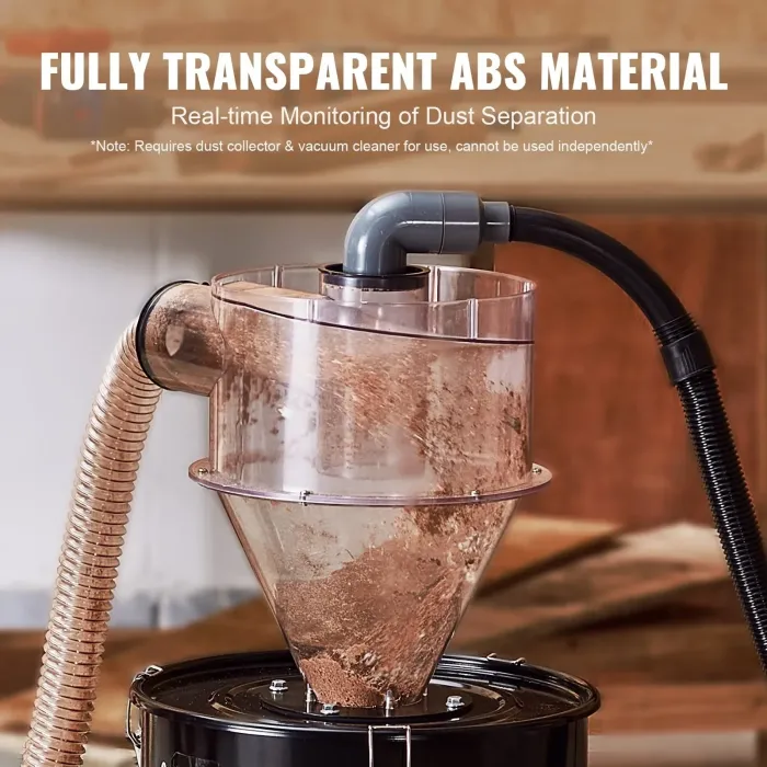 Прахоуловителят е с напълно прозрачен дизайн, което ви позволява да наблюдавате процеса на отделяне, без да отваряте устройството. Този ясен изглед гарантира, че можете да виждате събирането на прах в реално време, което прави поддръжката по-удобна и ефективна. Използвайки циклонна технология за отделяне, тя бързо улавя и отделя праховите частици със степен на отделяне до 99,61%, намалявайки честотата на смяна на вакуумния филтър.
