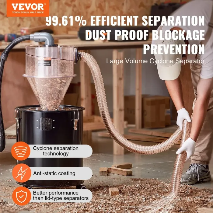 Идеален за различни приложения: Благодарение на високоефективното си разделяне, той лесно се справя със задачите по почистване в работилници или дървообработващи студия. Независимо дали работите с фини дървени стърготини или по-едри отпадъци, този сепаратор гарантира, че работното ви място ще остане чисто.