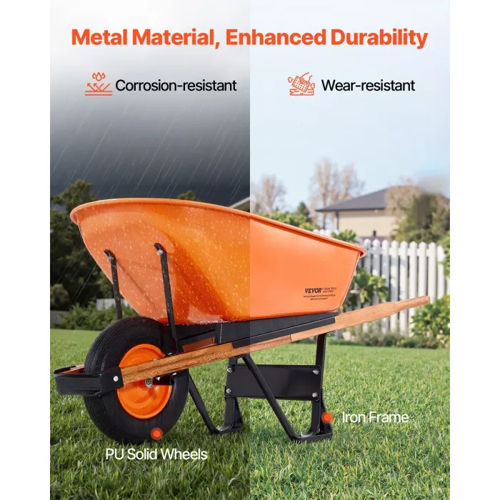 Изработена със здрава метална рамка и здрава желязна поставка, тази количка с едно колело е устойчива на деформация и напукване. Патентованото колело от твърда полиуретанова пяна е устойчиво на износване, намалява шума и елиминира риска от спукване по време на употреба на открито.