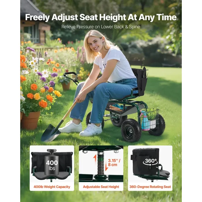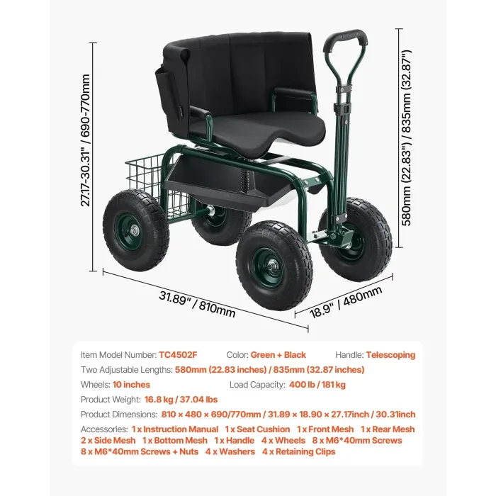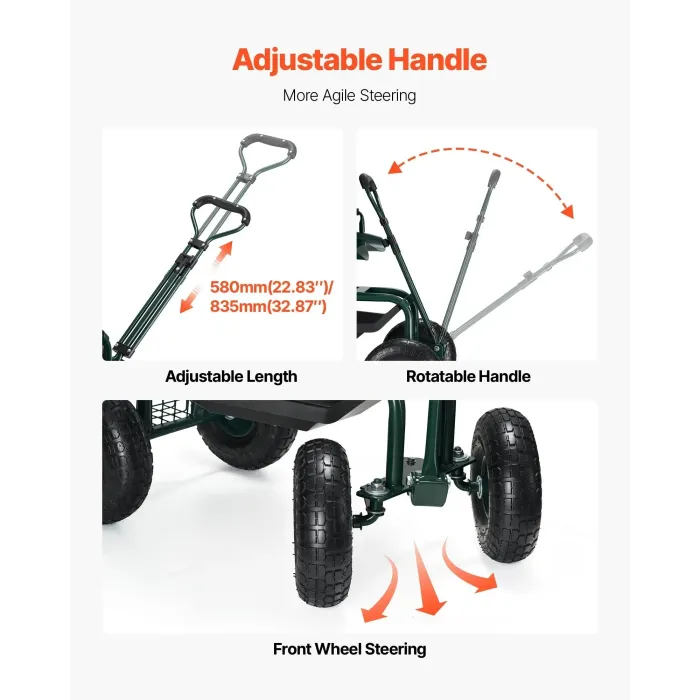 Тази градинска количка с подвижна седалка е с 10-инчови надуваеми гуми, които абсорбират неравности, осигурявайки плавно возене по неравен терен. Регулируемата дръжка (от 22,83” до 32,87”) улеснява движението ѝ из двора, спестявайки ви усилия, като същевременно осигурява лекота на използване.