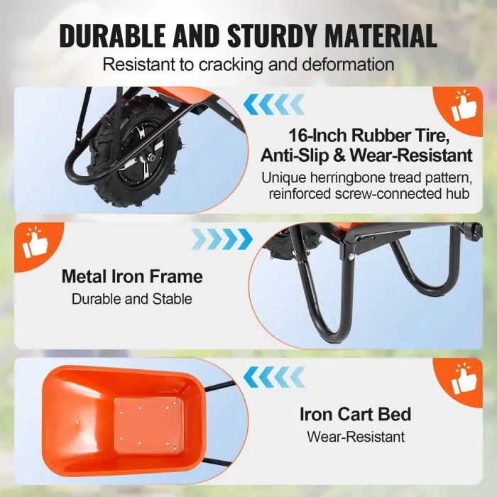 Здрава конструкция: Изработена със здрава метална рамка и желязна тава, тази електрическа градинска количка за отпадъци е проектирана да устои на деформация и износване. Гумените надуваеми гуми повишават издръжливостта и намаляват шума, като същевременно минимизират риска от спукване.