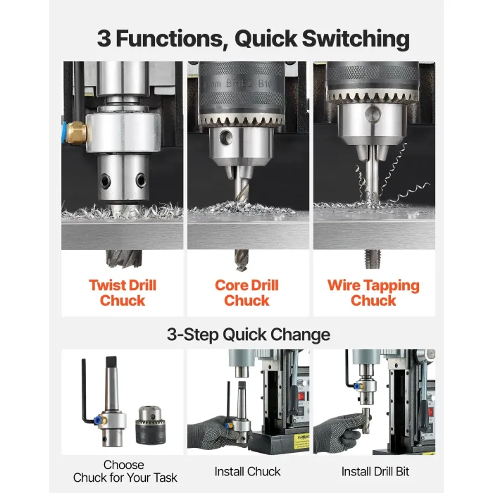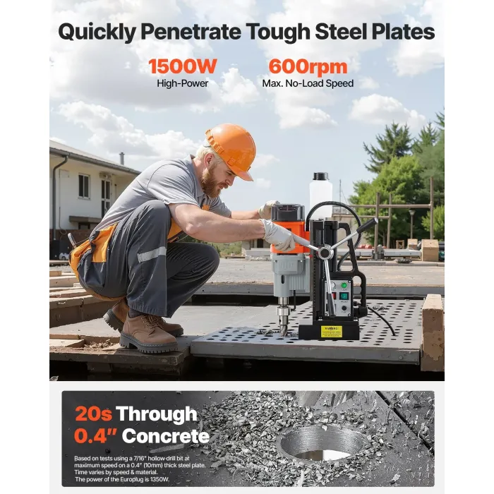 Ефективна: Задвижвана от 1500W мотор, тази магнитна бормашина осигурява мощна производителност за ремонт на дома, монтаж на оборудване, стоманени конструкции, корабостроене, мостови и железопътни проекти, вятърна енергия, електроцентрали и други - готова за всяка работа, навсякъде.