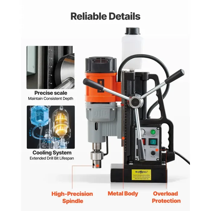 Надеждни детайли: Здравият метален корпус, високопрецизният шпиндел, ефективната система за охлаждане и изключването при претоварване осигуряват точност, сигурност и стабилност при продължителна употреба. Нашата магнитна бормашина ви дава увереност при интензивна употреба.