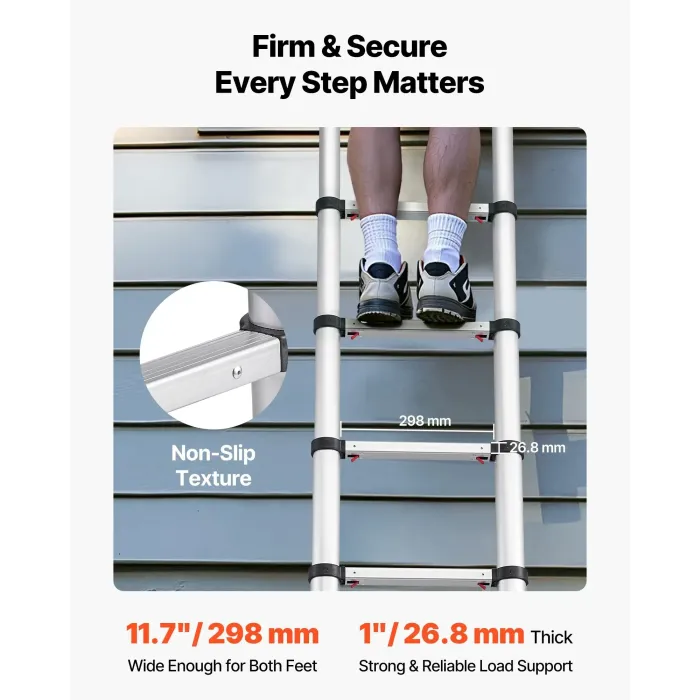 Разширени стъпала: Стъпалата на тази разтегателна стълба са разширени до 3,8 см за по-удобна и стабилна повърхност за стоене. Това спомага за намаляване на умората по време на продължителни периоди на стоене, което улеснява изпълнението на задачи на голяма надморска височина.