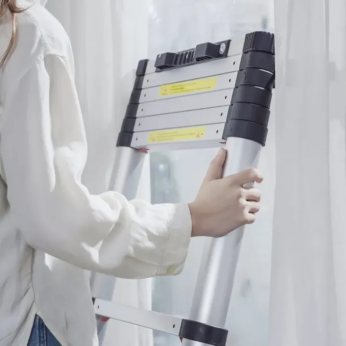 Лесна за носене и съхранение: Тази 3-метрова телескопична стълба е лека и лесна за носене. Жените също могат да я носят без усилие благодарение на леката ѝ рамка. Можете да я поставите почти навсякъде, включително под дивана, зад вратата и в багажника на колата. Тя е по-преносима и заема по-малко място от традиционните обемисти стълби. Изборът никога не е бил по-лесен. Бъдете в крак с времето и обновете арсенала си!