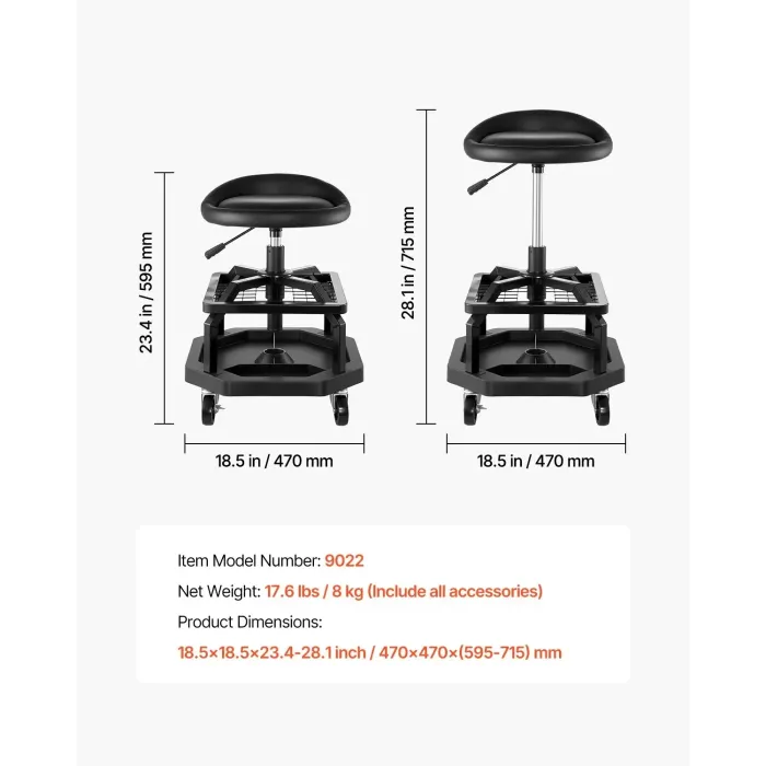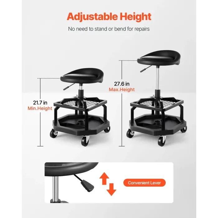 Този гаражен стол включва 2 големи тави за инструменти за лесно съхранение на гаечни ключове, винтове и други инструменти, подобрявайки ефективността на вашите ремонтни дейности. Височината на този стол за работа може да се регулира от 21,7-27,6 инча / 550-700 мм (височина на седалката от земята) с помощта на пневматичното повдигане, което ви позволява да намерите идеалната позиция за вашия ръст и тип тяло, като ви избягва навеждане или прегърбване по време на работа.