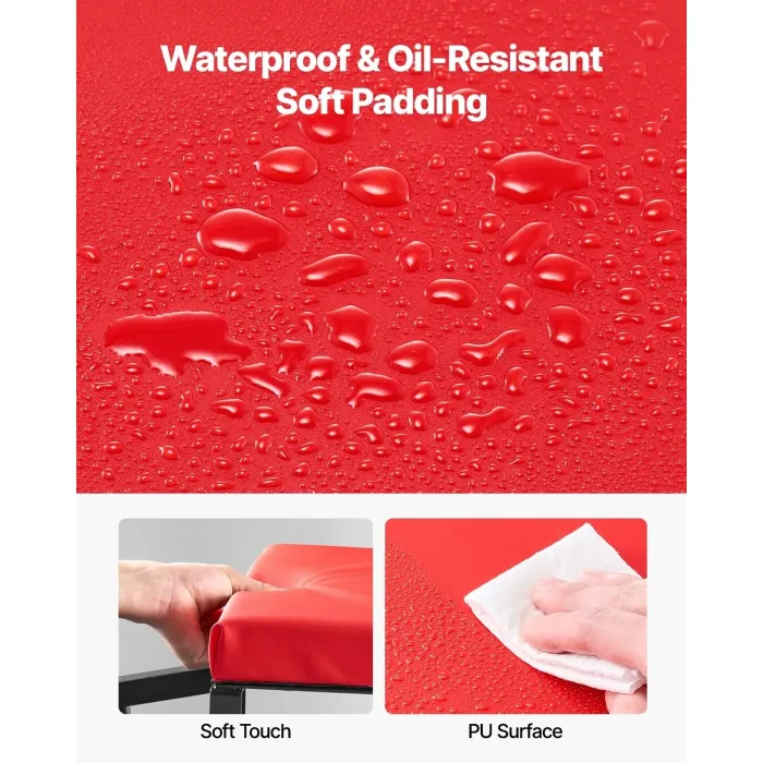 Водоустойчива възглавница: С голяма, мека перлена памучна възглавница, която позволява дълги часове седене по време на работа. Повърхността е от водоустойчива и маслоустойчива PU синтетична кожа, която е лесна за почистване, което го прави идеален за гараж, крайпътни и вътрешни/външни ремонтни и почистващи задачи.