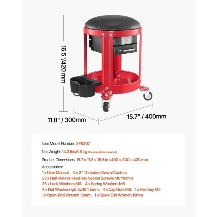 Изработен със здрава рамка от въглеродна стомана и подсилени винтове, този работен стол издържа до 136 кг и запазва формата си при продължителна употреба. Стабилният център на тежестта гарантира, че той остава изправен и помага да се избегне преобръщане. Този подвижен стол разполага с две чекмеджета, тава за инструменти и два държача за кутии, осигуряващи достатъчно място за съхранение на инструменти и аксесоари и осигуряващи по-подредено и организирано работно място.