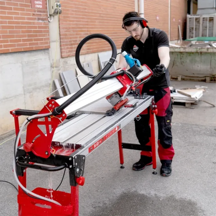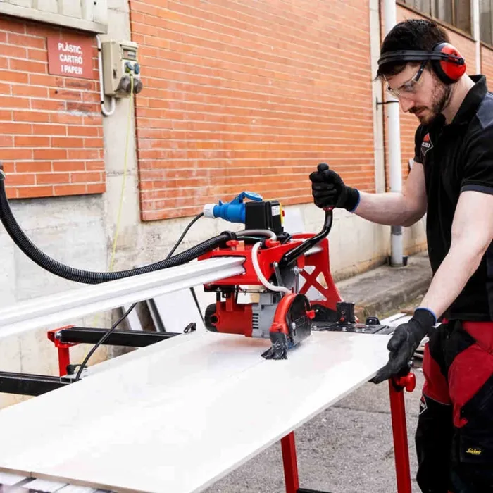 Електрическа машина с режещ ефект. Мотор, монтиран на лагери за максимална прецизност и надеждност. Универсален мотор 1800W (2,4CV). Включен диамантен диск TVR 125 мм (режещ инструмент, съвместим с дискове 115-130 мм). Подсилено алуминиево шаси (система с двойна греда). Подобрява стабилността и твърдостта на шасито. Система за безопасност на дисковете. Оборудвана със система ZERO DUST. Ергономични подобрения при транспортиране и регулиране (регулиране на двигателя, регулиране на опората, регулиране на колелата на каретката).