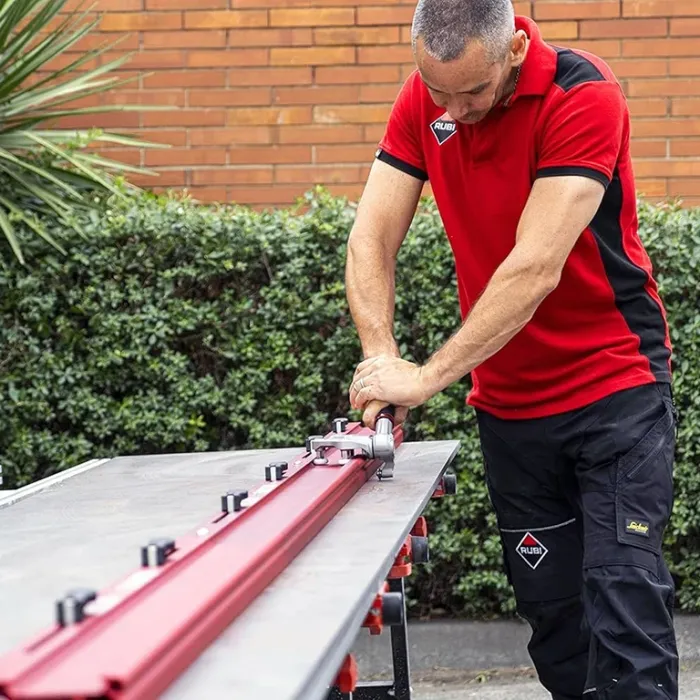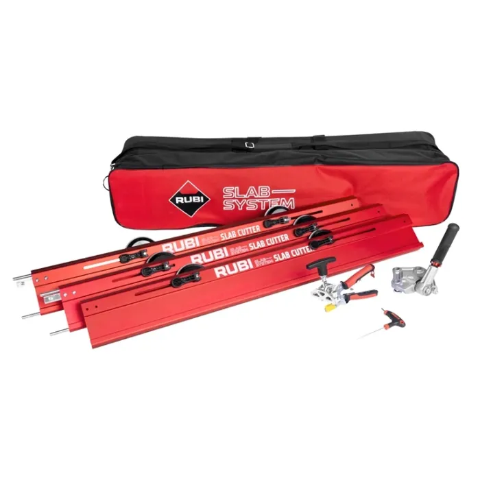 Новите водачи G3 са изработени от червен алуминий, а конструкцията им не позволява на каретката да излезе от тях и подобрява системата за закрепване помежду им. Всеки водач включва две вендузи за закрепване към плочката, а гумената им основа не оставя следи върху светли материали. В допълнение към трите водача и каретката, машината разполага и с инструмента за разделяне на плочите с двойна функционалност - под формата на щипка за плочи с дебелина до 6 мм и със скоба на винт за плочки до 10 мм. Дръжката Soft-Grip осигурява ергономичност и комфорт по време на работа. Rubi SLAB CUTTER G3 е ръчна система за рязане на широкоформатни порцеланови плочки с максимална дължина 320 см. Каретката е изработена от алуминий и упражнява по-голяма мощност на маркиране. Движението й през водачите е плавно и прецизно благодарение на трите хоризонтални лагера. Има карбидно режещо колело Extreme с диаметър 9,5 мм, подходящо за работа върху материали с грубо и структурирано повърхностно покритие и гладки или полирани покрития.