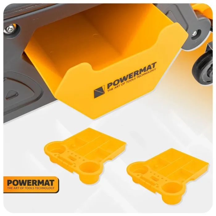 Седалката е оборудвана с три подвижни тави, които позволяват удобно съхранение на инструменти, винтове и малки предмети директно на работното място.