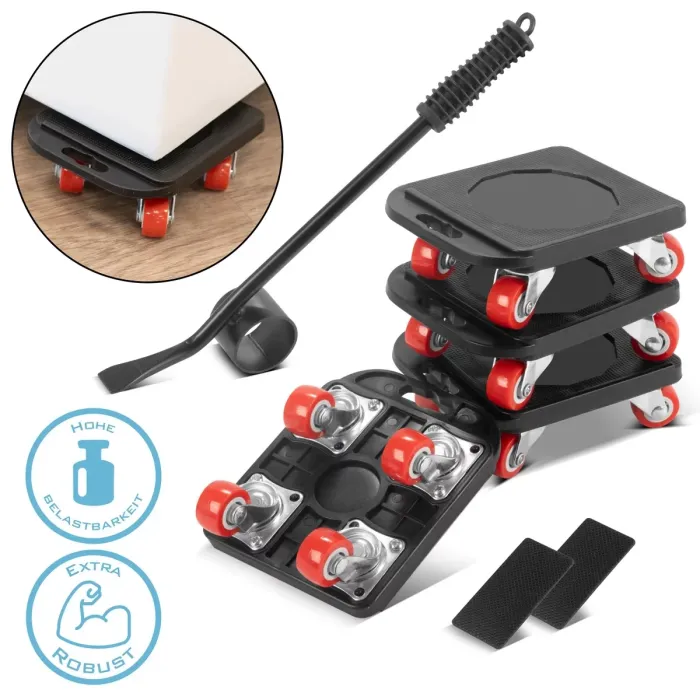Интегрираната транспортна защита по външните ръбове на мебелните колички осигурява допълнителна безопасност по време на транспортиране. Гумираните дълготрайни колелца могат да се завъртат на 360°, което осигурява на колелцата максимална стабилност и издържа на най-високите натоварвания. Повдигачът за мебели, включен в комплекта, улеснява повдигането на мебели и обемисти предмети. Ергономично оформената дръжка е лесна за хващане и осигурява оптимално предаване на силата. Комплектът за транспортиране на мебели включва и два стикера с оребрена повърхност, които осигуряват допълнителна стабилност. Универсалното транспортно средство е идеално за преместване и транспортиране на тежки, обемисти предмети. Практичният комплект за транспортиране на мебели STAHLWERK с 4 здрави транспортни ролки и стабилен повдигач за мебели е идеален за транспортиране на мебели, растения, кутии за преместване и др. Мебелните ролки имат противоплъзгаща повърхност, която ефективно предотвратява подхлъзване на товара.