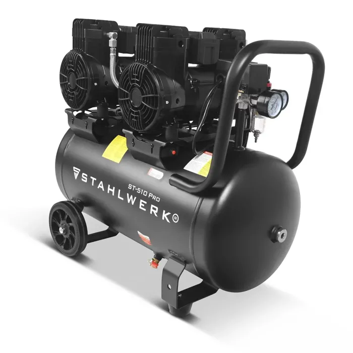 Безшумният компресор впечатлява с плавния си ход и ниските си шумови емисии от само 70 dB, дори при работа с максимална мощност. Здравите гумени крачета гарантират, че компресорът стои стабилно. Компресорите отговарят на Директива 2014/29/ЕС и са особено подходящи за високите изисквания в промишлеността и търговията. Мощният въздушен компресор е един от най-силните и леки в своя клас, идеален за професионална употреба в промишлеността, търговията, работилниците и „Направи си сам“.
