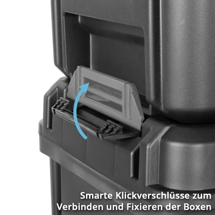 Перфектна система за съхранение и транспорт за работилницата: Комплектът мобилни кутии за инструменти в гъвкавата модулна система е изключително универсален и е идеален за съхранение на инструменти. Здравите кутии за инструменти, изработени от здрава PP пластмаса, могат лесно да се свързват една с друга благодарение на интелигентна щракваща система. Висококачественият комплект се състои от мобилна подвижна платформа с четири гумирани колелца (две от които имат ръчна спирачка) и три здрави транспортни кутии с различни размери.