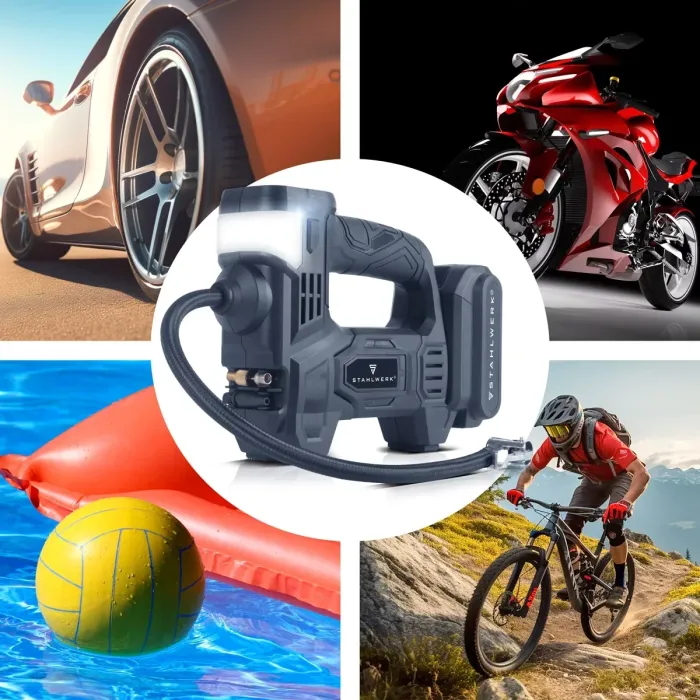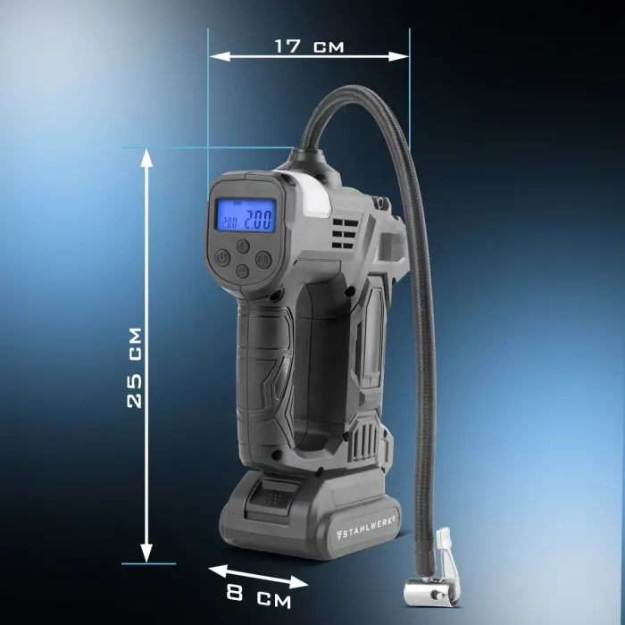 Благодарение на работата си с батерии, мини компресорът може да се използва в движение, напълно независимо от фиксирани източници на захранване. Цифровият дисплей за налягане позволява прецизна настройка на желаното налягане на въздуха, а вградената функция за автоматично изключване спира компресора автоматично веднага щом се достигне предварително зададеното налягане. Компактният дизайн улеснява транспортирането и боравенето в различни среди. Безжичният въздушен компресор STAHLWERK ADK-20 ST е универсално устройство за широк спектър от приложения. Независимо дали става въпрос за автомобилни и велосипедни гуми, спортни топки или надуваеми матраци - компресорът предлага практично и гъвкаво решение за всякакви задачи по напомпване. Благодарение на вградената LED светлина, която може да се превключва на две нива на яркост или червена предупредителна светлина, помпата за гуми е подходяща и за безопасна употреба през нощта или в слабо осветена среда. Въздушният компресор е идеалният помощник за „Направи си сам“ проекти, ежедневна употреба и професионални приложения.
