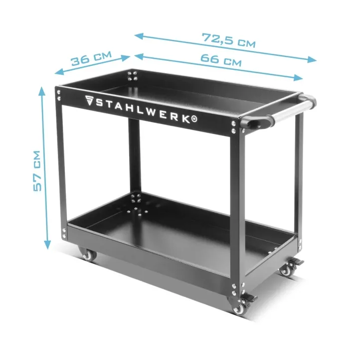 Дълбочината на рафтовете гарантира, че всичко винаги си стои на мястото, а инструментите са винаги на разположение. Мобилната транспортна количка има две гъвкави въртящи се колела със заключващи се спирачки и две фиксирани колела, които са изработени от издръжлива пластмаса и са изключително устойчиви на износване. Практичната количка за инструменти внася ред във всяка работилница: Оборудвана с два просторни рафта, рафтовата количка гарантира много място за големи и малки инструменти. Отвореният дизайн на работилническата количка позволява неограничен и бърз достъп от всички страни. Интегрираната дръжка улеснява маневрирането и управлението на инструменталната количка, дори в ограничени пространства, а здравата стоманена конструкция осигурява на платформената количка максимална стабилност и висока издръжливост. Благодарение на компактния си размер, многофункционалната монтажна количка се вписва и в малки работилници, гаражи и други работни места. С висококачественото си покритие, ръчната количка е подходяща за професионална употреба в промишлеността, търговията, търговията и „Направи си сам“.