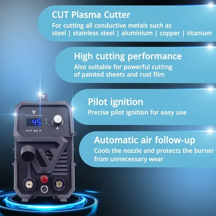 Апарата за плазмено рязане STAHLWERK CUT 50 P е мощен и много компактен режещ инвертор за прецизно рязане на електропроводими метали. Безстепенно регулируемият режещ ток от 15 до 45 A покрива широк спектър от приложения - от тънки листове до плътни плочи от конструкционна стомана. HF пилотното запалване осигурява удобно, безконтактно запалване на плазмената дъга.