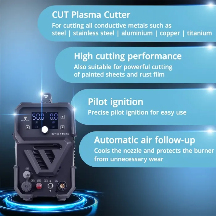 В зависимост от материала, възможни са разрези до 20 мм с мека стомана (ST37), 8 мм с неръждаема стомана (V2A/V4A) и 5 мм с алуминий. Дори боядисани и леко ръждясали детайли могат да се обработват чисто и ефективно. Интегрираното интелигентно охлаждане, защитата от прегряване и класът на защита IP21S осигуряват надеждна и издръжлива работа. Благодарение на THC интерфейса, CUT 50 P Digital може да се управлява с CNC системи за автоматично регулиране на разстоянието на горелката до детайла според напрежението на дъгата.