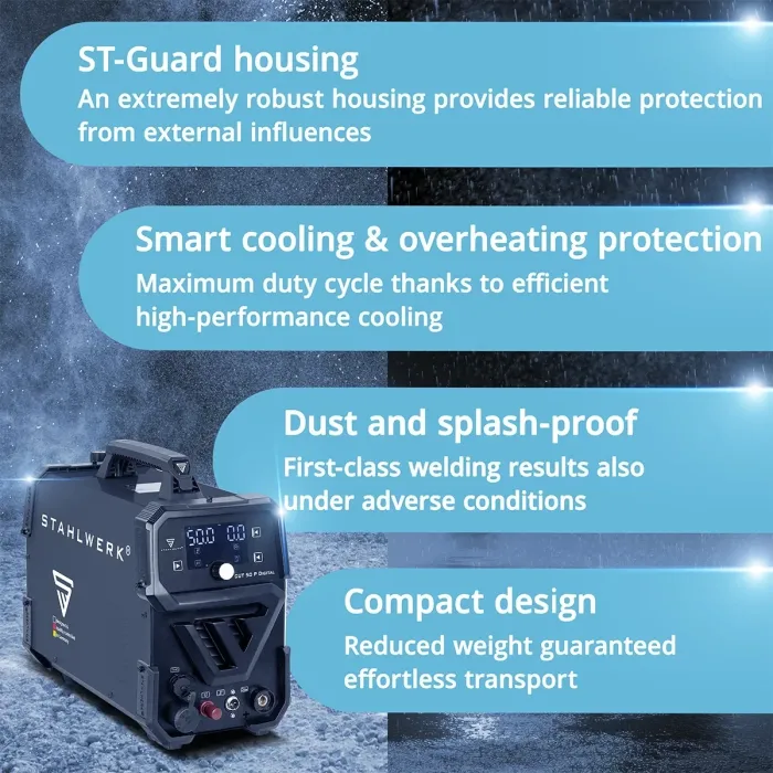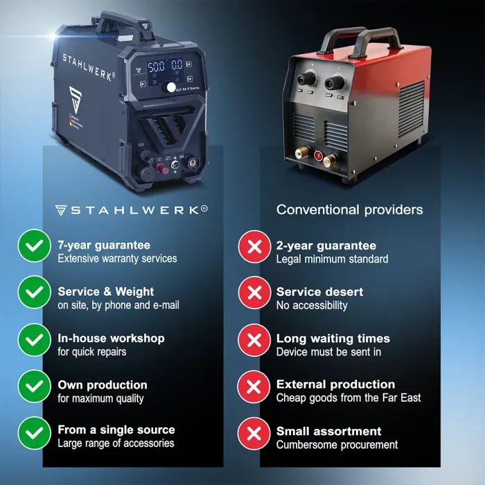 Апарата за плазмео рязане STAHLWERK CUT 50 P Digital е мощен и компактен режещ инвертор за прецизно рязане на електропроводими метали. Безстепенно регулируемият ток на рязане от 15 до 50 A покрива широк спектър от приложения - от тънки листове до плътни плочи от конструкционна стомана. HF пилотното запалване осигурява удобно, безконтактно запалване на плазмената дъга; алтернативно е налично и контактно стартиране.