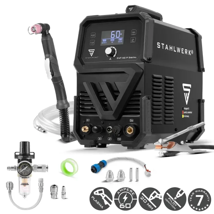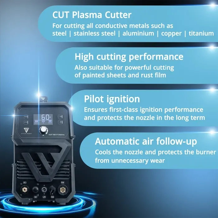 Апарата за плазмено рязане STAHLWERK CUT 60 P Digital е мощен и компактен режещ инвертор за прецизно рязане на електропроводими метали. Безстепенно регулируемият ток на рязане от 30 до 60 A покрива широк спектър от приложения - от тънки листове до плътни плочи от мека стомана. HF пилотното запалване осигурява удобно, безконтактно запалване на плазмената дъга; алтернативно е налично и контактно стартиране. Плазмената машина за рязане STAHLWERK CUT 60 Pilot IGBT се доставя с богат пакет аксесоари и е готова за незабавна употреба. Времето за предварителен и последващ въздушен поток може да се настройва индивидуално на устройството, а по-дългото време за последващ въздушен поток подобрява охлаждането и по този начин допринася за удължаване на експлоатационния живот на износващите се части.