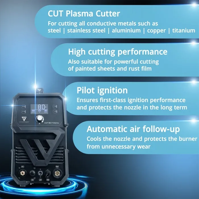 Апарата за плазмено рязане STAHLWERK CUT 80 P Digital е мощен и компактен режещ инвертор за прецизно рязане на електропроводими метали. Безстепенно регулируемият ток на рязане от 30 до 80 A покрива широк спектър от приложения - от тънки листове до плътни плочи от конструкционна стомана. HF пилотното запалване осигурява удобно, безконтактно запалване на плазмената дъга; алтернативно е налично и контактно стартиране.