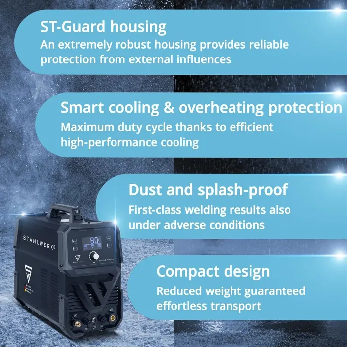 Лек и компактен дизайн - С тегло от 19,6 кг и размери от 485 x 238 x 437 мм, устройството е лесно за транспортиране и идеално е подходящо за взискателни работи по рязане. Иновативните IGBT транзистори спестяват място и тегло в сравнение със старата MOSFET технология.