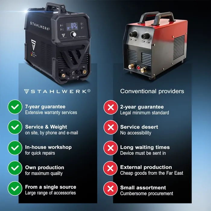 Плазмената машина за рязане STAHLWERK CUT 80 Pilot IGBT се доставя с богат пакет аксесоари и е готова за незабавна употреба. Времето за предварителен и последващ въздушен поток може да се настройва индивидуално на устройството. По-дългото време за последващ въздушен поток подобрява охлаждането и по този начин допринася за удължаване на експлоатационния живот на износващите се части.