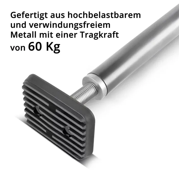 Благодарение на плавно движещ се затягащ лост, опорната плоча и вътрешната тръба могат да се освободят и удължат до желаната дължина, след което отново да се фиксират сигурно. Това позволява на опорния прът да държи различни компоненти стабилно за кратки периоди от време. Идеална е за подравняване и фиксиране на монтажни елементи, преди да бъдат окончателно закрепени. Допустим е максимален ъгъл на наклон от 65° за използване в наклонено положение, с допустимо натоварване от 20 кг.