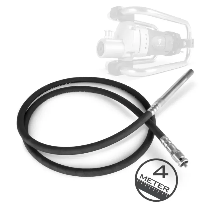 С обща дължина от 4 метра и диаметър на свързване от 35 мм, тя е идеална за употреба върху основи, подови плочи, прегради, колони, стени и кофраж. Ефективният процес на уплътняване придава на бетона хомогенна структура, повишена якост и подобрена устойчивост на замръзване - решаващите фактори за трайна и професионална строителна работа. Здравата вибрираща бутилка впечатлява с високата си производителност, прецизна изработка и издръжливост. Използва се заедно с подходящ вибратор за бетон или бетоноуплътнител за професионално уплътняване на пресен бетон и надеждно отстраняване на кухини, кухини и задържани въздушни мехурчета. По време на работа вибриращата бутилка се вкарва в все още течния бетон. Вътрешен, гъвкав стоманен вал предава въртеливото движение на задвижването към бутилката и генерира мощни вибрации. Тези вибрации уплътняват бетона равномерно и транспортират задържания въздух нагоре, създавайки плътна, стабилна бетонна маса. Висококачественият, закален стоманен цилиндър осигурява дълъг експлоатационен живот и е устойчив на удар и износване. Гъвкавият свързващ маркуч е устойчив на масло и е защитен от здраво пластмасово покритие, което също така осигурява издръжливост и надеждна работа дори при взискателни условия на строителната площадка.