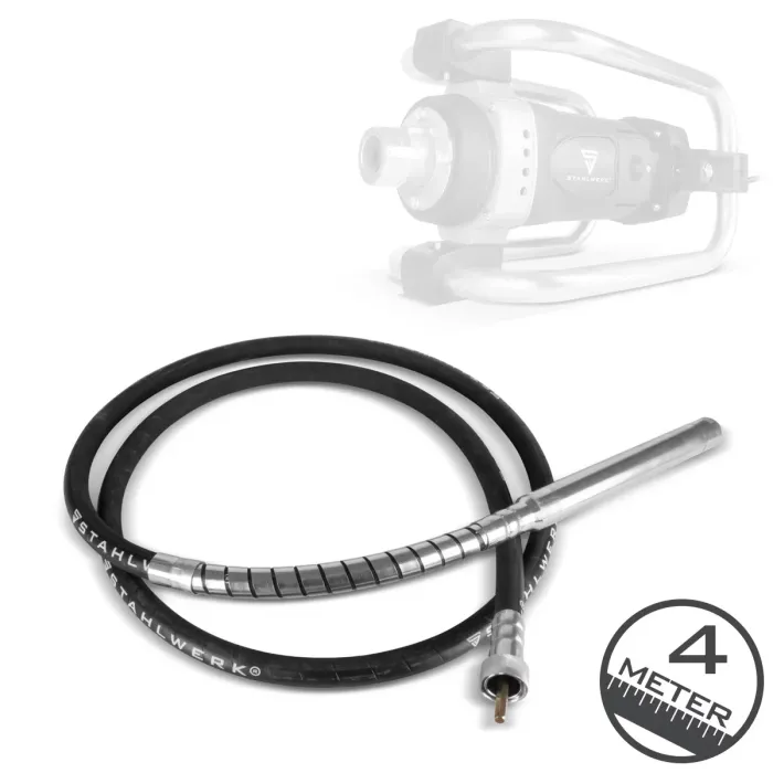 С обща дължина от 4 метра и диаметър на свързване от 45 мм, тя е идеална за употреба върху основи, подови плочи, прегради, колони, стени и кофраж. Ефективният процес на уплътняване придава на бетона хомогенна структура, повишена якост и подобрена устойчивост на замръзване - решаващите фактори за трайна и професионална строителна работа. Здравата вибрираща игла впечатлява с високата си производителност, прецизна изработка и издръжливост. Използва се заедно с подходящ вибратор за бетон или бетоноуплътнител за професионално уплътняване на пресен бетон и надеждно отстраняване на дупки, кухини и затворени въздушни мехурчета. По време на работа вибриращата игла се вкарва в все още течния бетон. Вътрешен, гъвкав стоманен вал предава въртеливото движение на задвижването към иглата и генерира мощни вибрации. Тези вибрации уплътняват бетона равномерно и транспортират затворения въздух нагоре, създавайки плътна, стабилна бетонна маса. Висококачественият, закален стоманен цилиндър осигурява дълъг експлоатационен живот и е устойчив на удар и износване. Гъвкавият свързващ маркуч е устойчив на масло и е защитен от здраво пластмасово покритие, което също така осигурява издръжливост и надеждна работа дори при взискателни условия на строителната площадка.