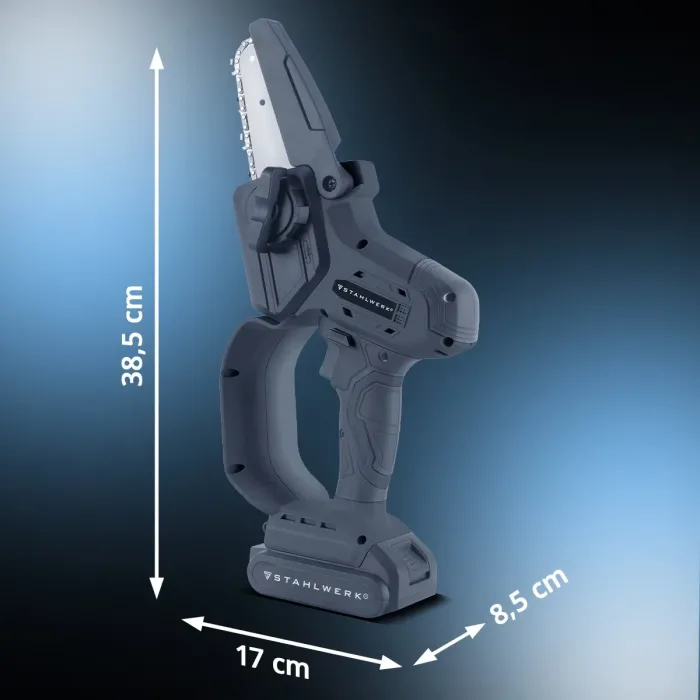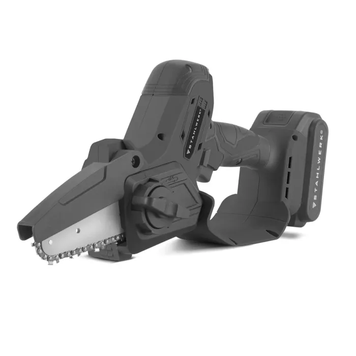 . Независимо дали става въпрос за ПДЧ, клони, летви, твърда или мека дървесина - мощният трион реже без усилие материали с дебелина до 90 мм. Благодарение на подвижната батерия, ръчният трион предлага свобода без кабел и максимална гъвкавост. В доставката са включени батерия с капацитет 2000 mAh и зарядно устройство. Компактният акумулаторен трион STAHLWERK mini е специално разработен за прецизна и многостранна работа в дома и градината, като например рязане и триониране на клони и дърво. Съвременната безчеткова технология гарантира много мощна и без износване работа. Капакът на веригата, вграденият предпазител за ръката и предпазният превключвател осигуряват безопасна употреба. Веригата и шината могат лесно да се сменят чрез заключващ механизъм без използване на инструменти. Ергономичният дизайн и лесното боравене правят акумулаторния трион идеален избор за градинарство, „Направи си сам“ проекти и професионални приложения.