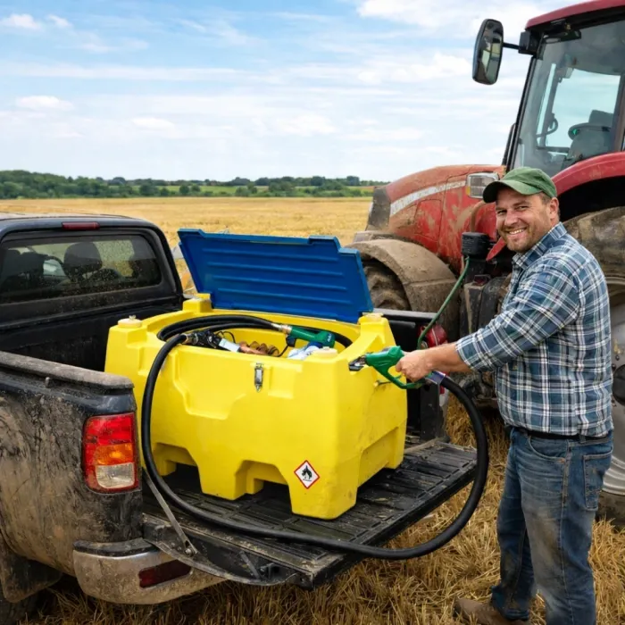 Резервоарът може лесно да се транспортира с пикап, ремарке или мотокар и да бъде позициониран директно до машината, която се зарежда.