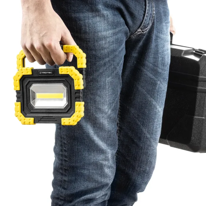 Проектиран за тежки условия, осветителят със защита от водни пръски IP44 има удароустойчива защита на ръбовете. Практичност: Дръжката за носене, която може да се регулира на 180° в шест степени, служи и като стабилна стойка за прецизно осветяване на работната зона. Тази гъвкавост се допълва от здрав магнитен държач - идеален за сигурно закрепване на работната лампа към метални повърхности.