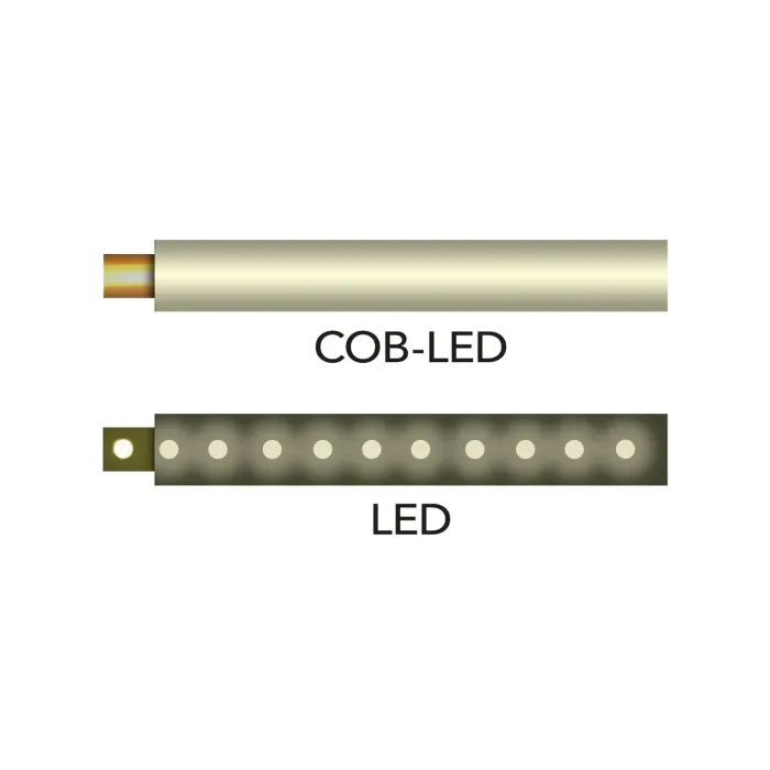 COB означава „чип на платка“ и се отнася до много равномерно светеща LED технология за светлинни източници. В сравнение с конвенционалните LED светлини, при които отделните светлинни диоди често са видими с просто око, работните светлини с високопроизводителни COB LED осветителни тела създават равномерно и пълноповърхностно разсейване на светлината. Цялата повърхност на COB-LED диодите се възприема като равномерно осветена зона.