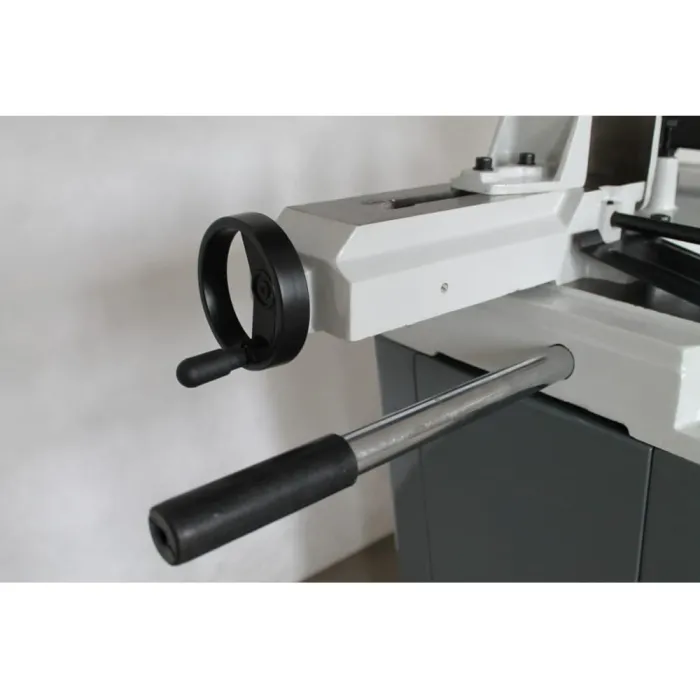 Масивната, стабилна и изпипана конструкция и рамото, изработено от чугун, осигуряват на машината много висока твърдост и стабилност при рязане, което се изразява в прецизност на формата. Скоростта на подаване се регулира на ролки. Имаме избор от три скорости на режещата лента 23, 34 и 54 м/мин.