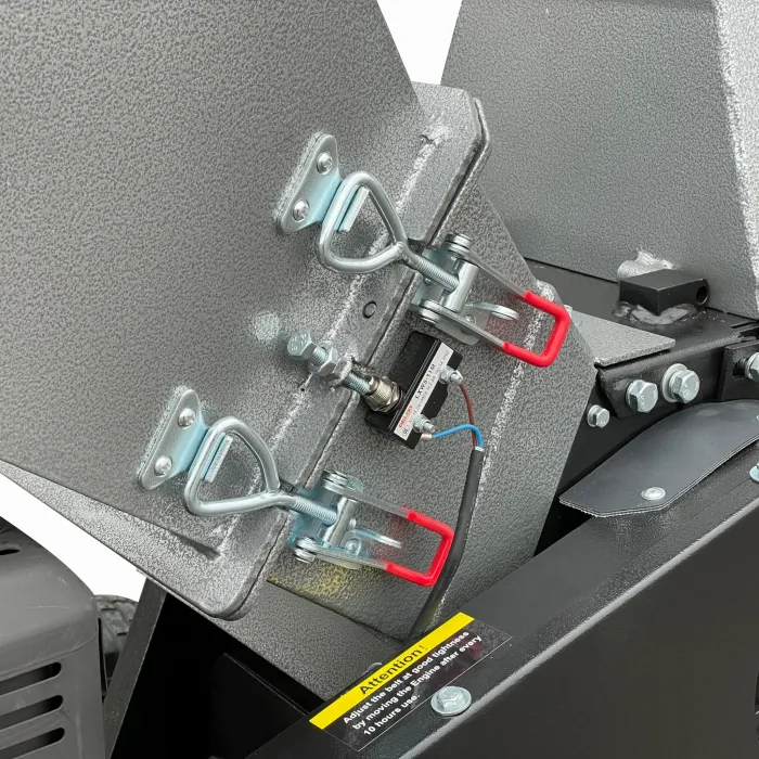 НОВИЯТ бункер е оборудван с бързо освобождаващи се скоби , благодарение на които можем бързо и лесно да стигнем до камерата за рязане. Фунията има и ограничителен изключвател , който предотвратява стартирането на машината по време на сервизни дейности.