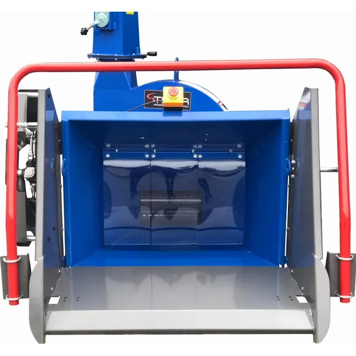 Произведените стърготини се хвърлят през тръба, завъртяна на 360° спрямо основата на дробилката.