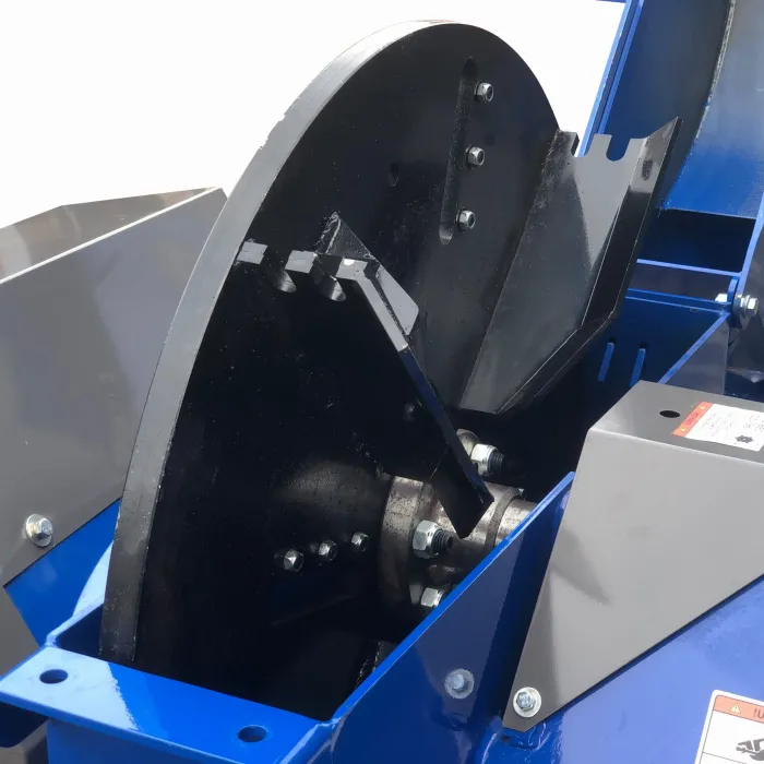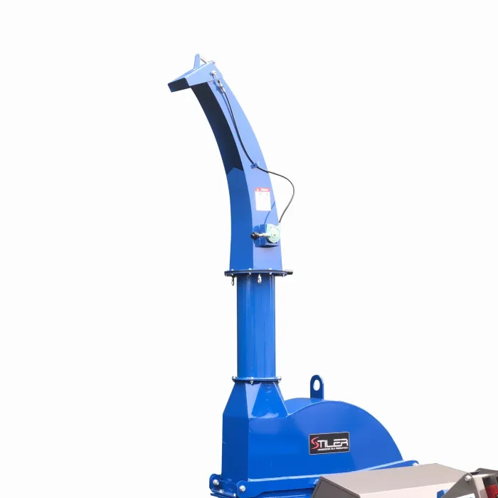Произведените стърготини се изхвърлят през тръба, завъртяна на 360° спрямо основата на дробилката.