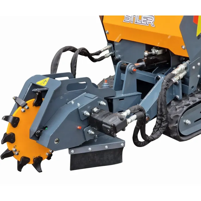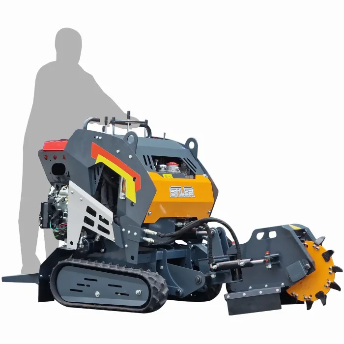 Фрезата за пънове STILER е предназначена за смилане и премахване на пънове на дървета. Задвижван изцяло от бензинов двигател и хидравлична система. Способен да смила пънове до дълбочина 240 мм! С ширина от само 79 см, тази машина е идеална за труднодостъпни места. Сменяемите режещи зъби на шлифовъчния диск са покрити с волфрамов карбид (видия), което осигурява изключителна издръжливост и острота. Мощният 4-тактов двигател с OHV двигател с мощност 27 к.с. и работен обем 740 см³ лесно се справя дори с най-трудните пънове. Високият резерв на мощност осигурява по-дълъг живот и ефективност на машината. Машината е оборудвана с вградена батерия – електрически старт с ключ. Машината разполага със собствено хидравлично задвижване на веригите. Шлифовъчната глава се управлява чрез хидравличен цилиндър. Шлифовъчният диск се задвижва от хидравличен мотор .