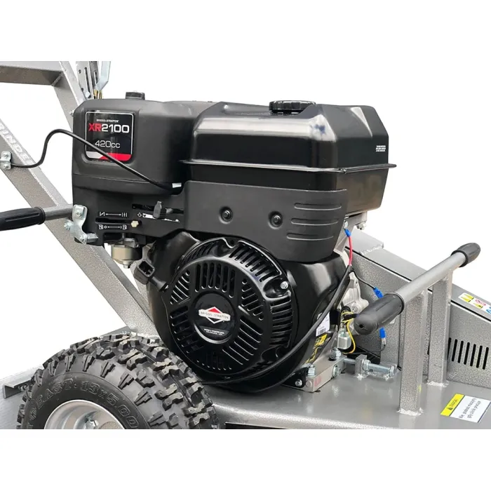 Фрезата е с ширина само 80 см, особено полезно на труднодостъпни места. Сменяемите зъби на фрезовия диск са покрити със синтерован карбид (widia), което осигурява висока твърдост на острието. Мощен 15 к.с. 4-тактов OHV двигател с обем 420 см3 от добре познатата и ценена марка B&S ни позволява да фрезоваме дори много твърди стволове без никакви проблеми. Големият резерв от мощност се изразява и в по-дълъг експлоатационен живот на машината.