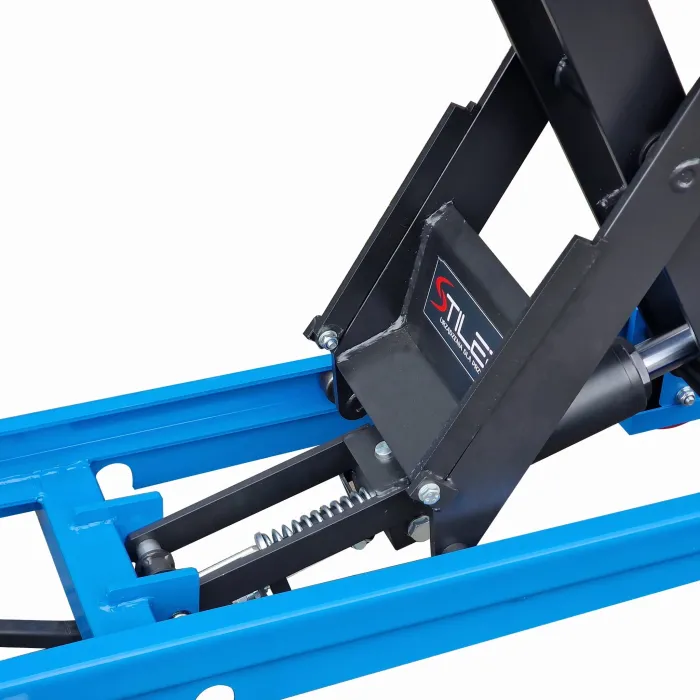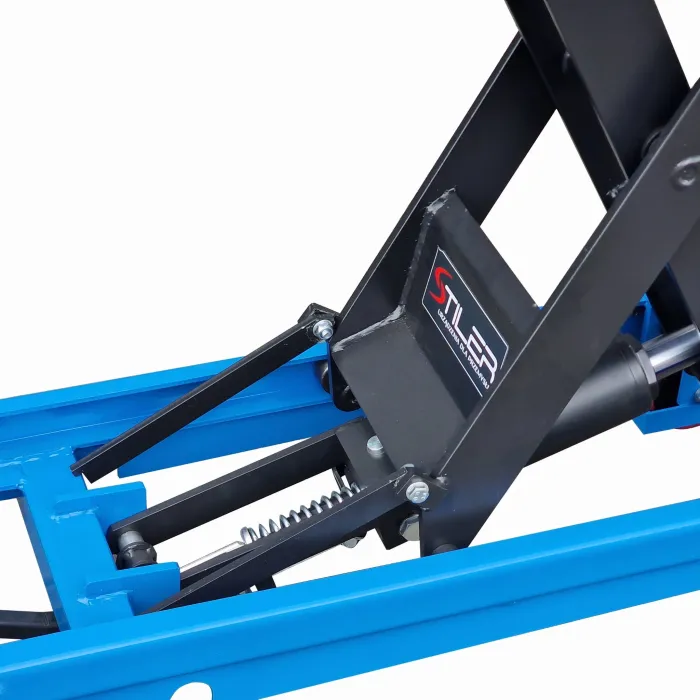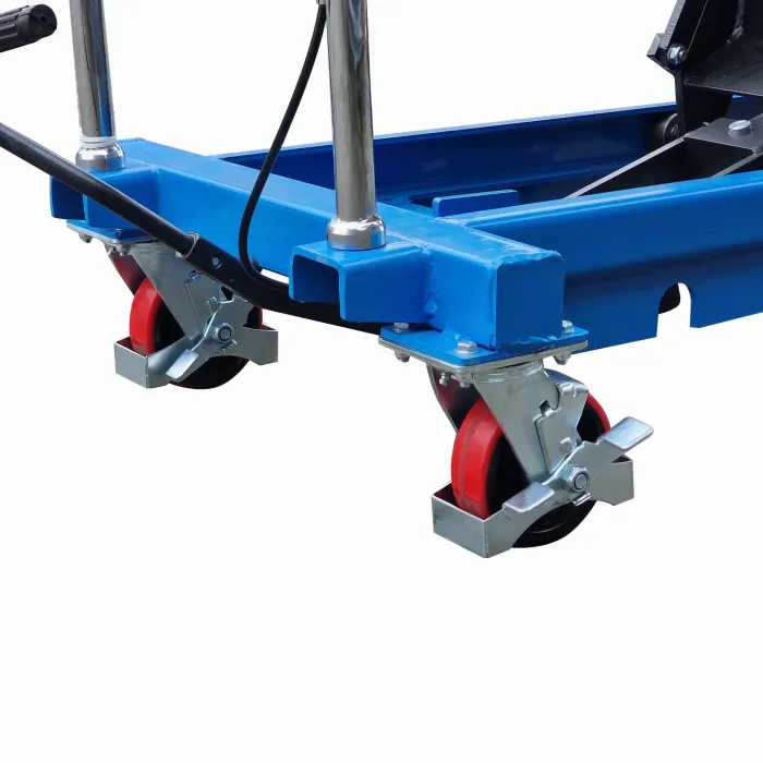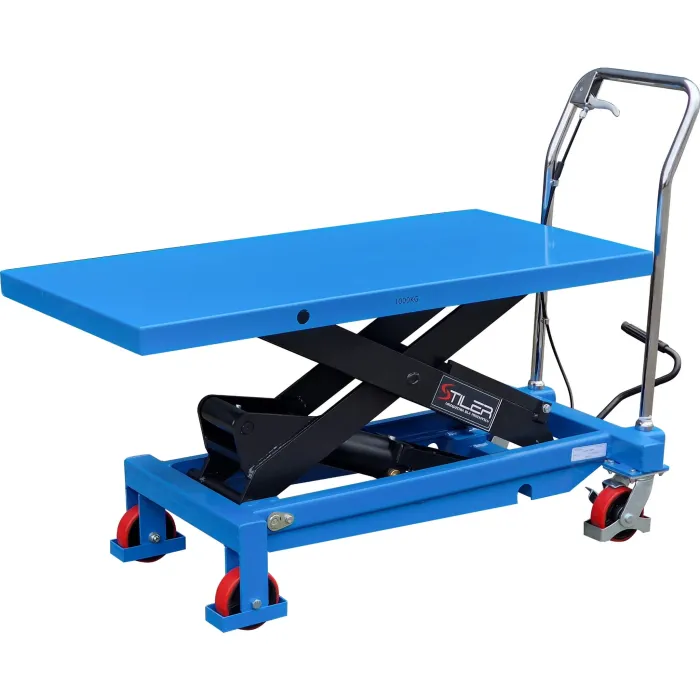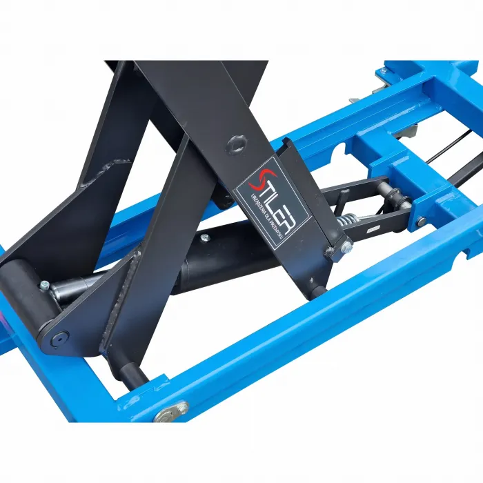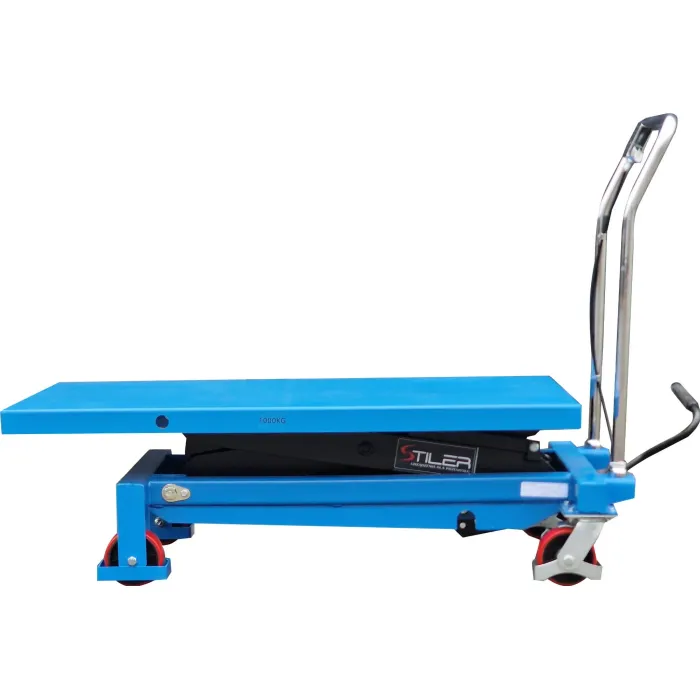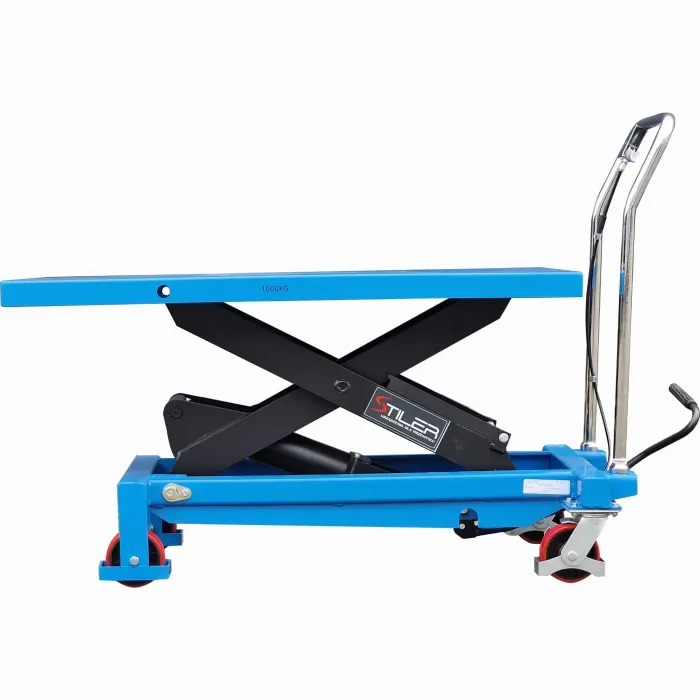 Подемната сила е 1 тон. Здравата конструкция позволява безпроблемна и стабилна работа дори при максимално натоварване. Механизъм, изработен от плоски стоманени пръти с дебелина 11 мм. Платформата се повдига с помоща на крачен лост, който задвижва хидравличния цилиндър. Благодарение на ръчния лост, може бързо и лесно да спуснем платформата на всякаква височина. Платформените колички са идеални за работилници, търговци на едро, складове и навсякъде, където е необходимо да се транспортират тежки товари. Големите полиуретанови колела 150x40 мм правят количката лека и лесна за преместване. И двете колела имат спирачка. Повдигащ механизъм, базиран на мощен хидравличен цилиндър.