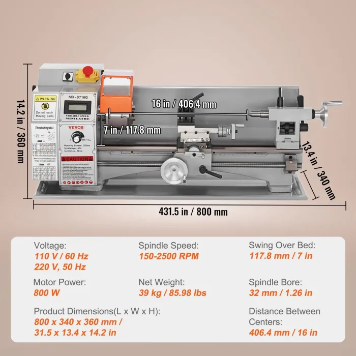 Метален струг 7'' x 16'' може да се използва за обработка на прецизни части и модели. Широкият диапазон от стъпки на струговане може да създаде 19 вида резби, 9 вида метрична система (0,5-3 мм) и 10 вида имперска система (10-44 TPI).