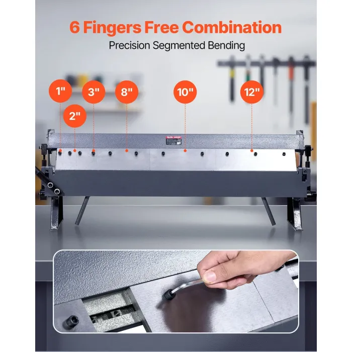 Оборудван с шест различни сегментни пръста (1", 2", 3", 8", 10", 12"), огъващата машина за ламарина позволява персонализирано огъване за справяне със сложни проекти като електрически корпуси, корпуси за инструменти и вентилационни канали.