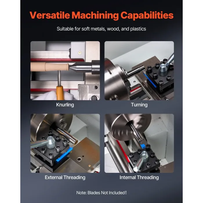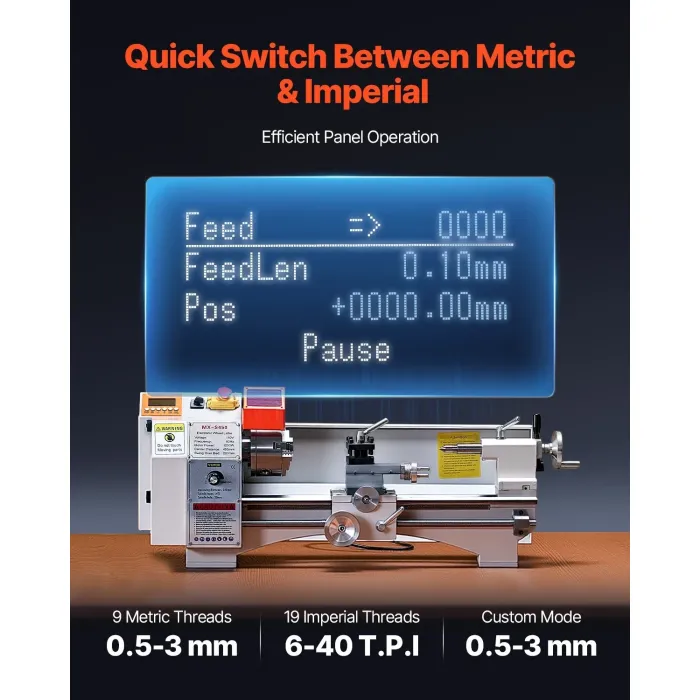 Безпроблемно превключване между метрични и имперски резби без смяна на зъбни колела. Нашият настолен метален струг ви спестява време с прости контроли на панела. Поддържа 9 метрични резби (0,5-3 мм), 19 имперски резби: 6-40 TPI и персонализиран режим: 0,5-3 мм