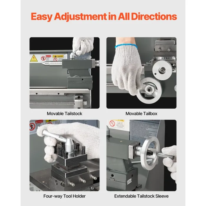 Лесно регулирайте металния струг в множество посоки за максимална гъвкавост. Внимателно изработените глава, заден капак, голям проходен отвор и 4-посочна инструментална стойка ви дават прецизен контрол над работата, осигурявайки плавни и точни резултати.