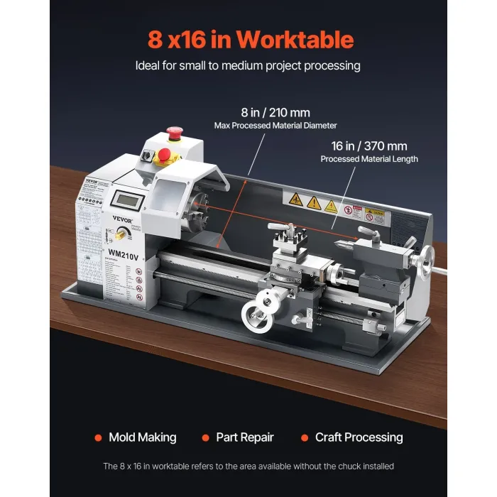 С максимален диаметър на обработвания материал от 8 инча (210 мм) и дължина от 16 инча (370 мм), този мощен металообработващ струг е идеален за работа със средни до малки проекти, като например изработване на калъпи, ремонт на части и занаятчийски дейности. Проектиран специално за професионалисти и любители на „Направи си сам“, той осигурява гъвкавост за различни задачи.