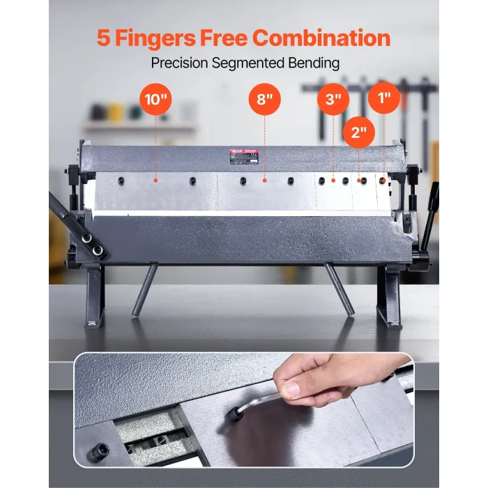 Оборудван с пет различни сегментни пръста (1", 2", 3", 8", 10"), огъвачка за ламарина позволява персонализирано огъване за справяне със сложни проекти като електрически корпуси, корпуси за инструменти и вентилационни канали.